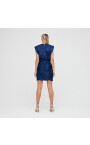 "Kort klänning i damask satin, symbolen för elegans, från Sabina Musayev-kollektionen. Klass och glans i satin kombineras med femininiteten i designen för att skapa en klänning som framhäver formerna med stil och sobrietet. Komposition: 55% viskos, 45% rayon. Färg: blå. Rund hals. Vadderad axel. Utskärning i ryggen. Kort, rynkad kjol. Tillverkad i Israel."